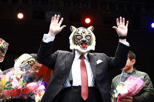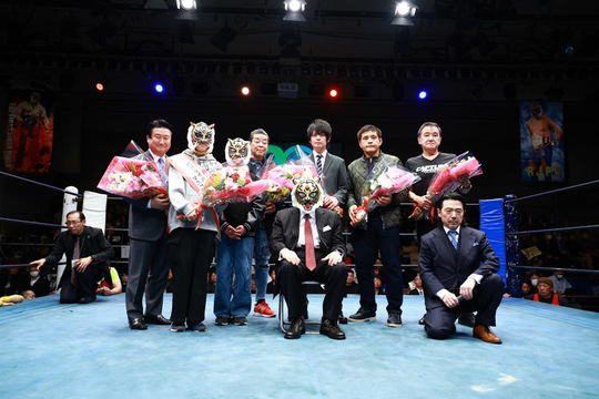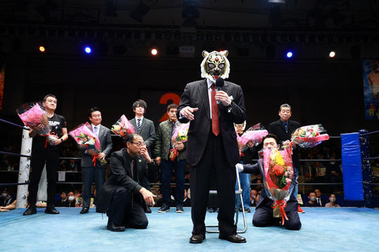 また大会には初代タイガーマスクが来場し、リング上から皆様にご挨拶をさせていただきました。セレモニーでは来年への抱負を語ったのち、関係者から花束贈呈を受けました。