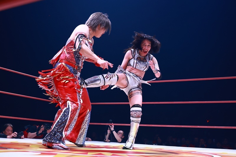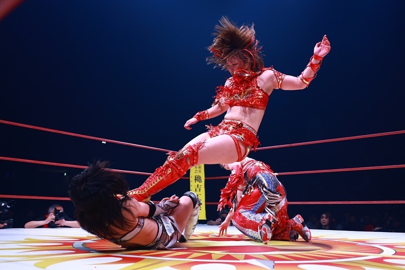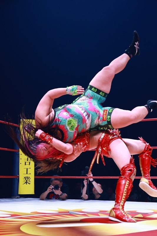 この日の主役・Sareee選手は彩羽匠選手とのタッグで、朱里&橋本千紘組と激突しました。女子プロレス界屈指の実力派がそろった一戦は、手に汗握る展開の連続。相手方のパワーとスピードに押される場面もありましたが、彩羽選手との好連係で巻き返すと、最後は裏投げを連発して橋本選手から3カウントを奪い、記念大会を勝利で飾りました。