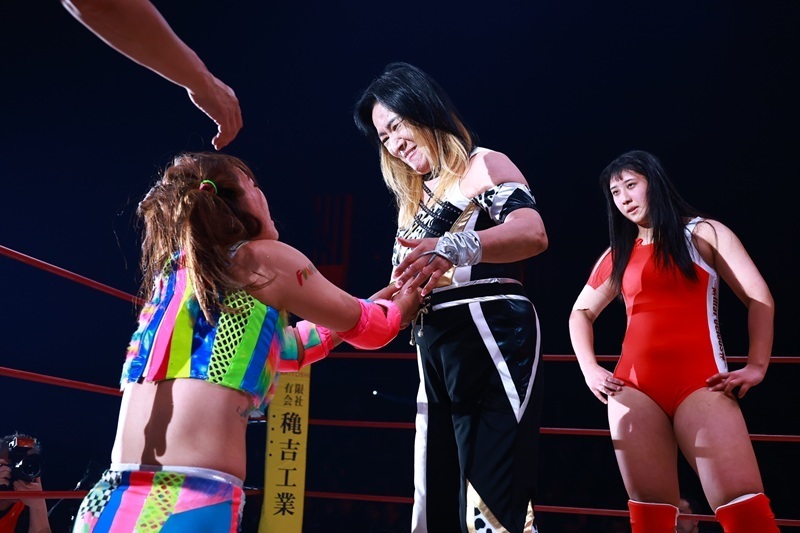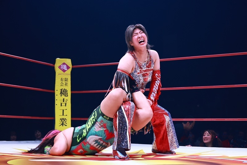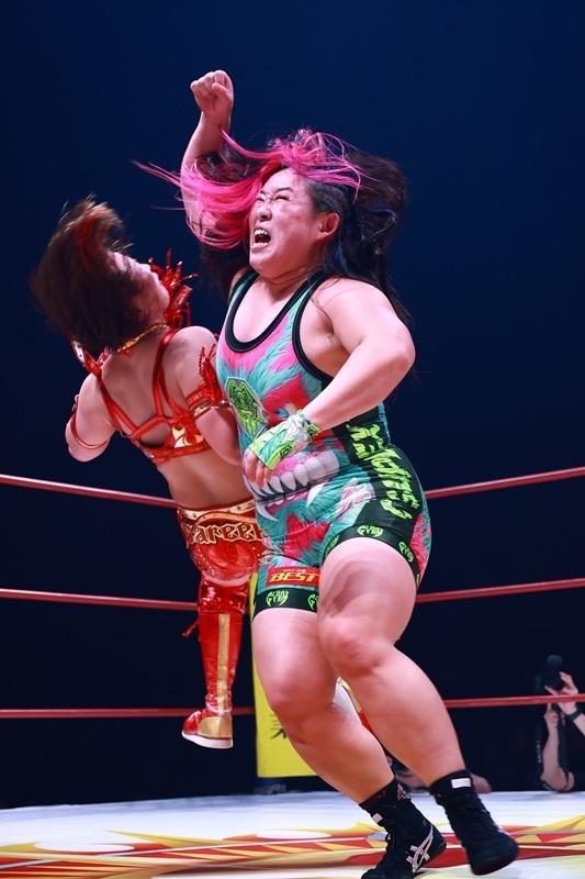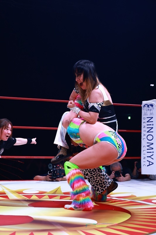 ジャガー横田選手は井上貴子選手と暁千華選手とのトリオで、神取忍&堀田祐美子&フワちゃん組と対戦しました。ベテラン勢と注目の若手がそろう豪華6人タッグマッチの主役となったのはやはりジャガー横田選手。井上選手と暁選手が神取・堀田両選手を押さえる中、孤立したフワちゃんを卍固めで捕らえてギブアップさせました。