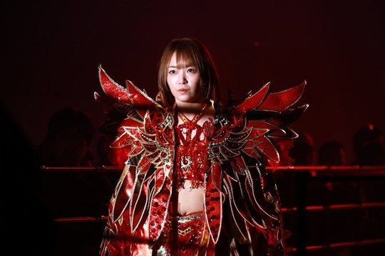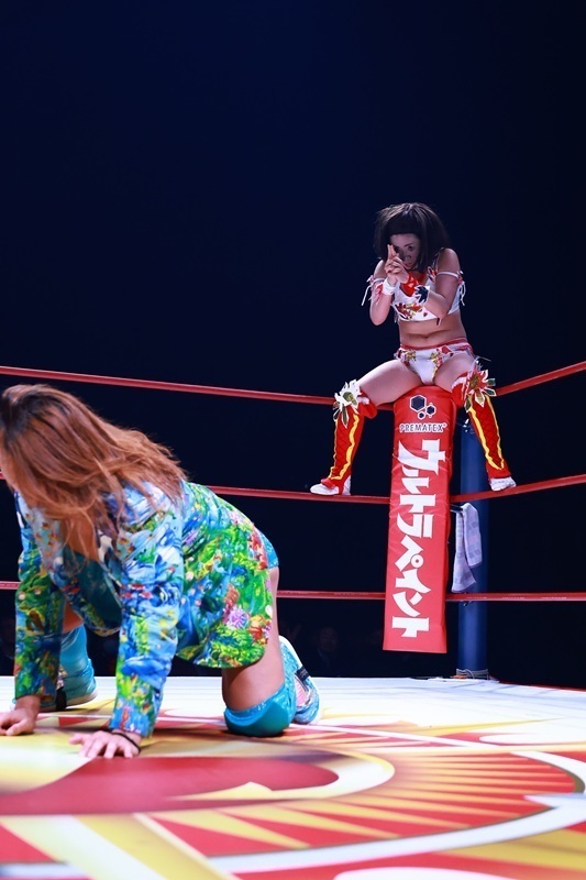 ジャガー横田選手は井上貴子選手と暁千華選手とのトリオで、神取忍&堀田祐美子&フワちゃん組と対戦しました。ベテラン勢と注目の若手がそろう豪華6人タッグマッチの主役となったのはやはりジャガー横田選手。井上選手と暁選手が神取・堀田両選手を押さえる中、孤立したフワちゃんを卍固めで捕らえてギブアップさせました。