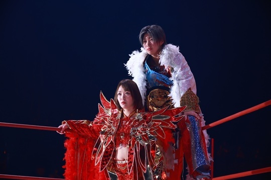 この日の主役・Sareee選手は彩羽匠選手とのタッグで、朱里&橋本千紘組と激突しました。女子プロレス界屈指の実力派がそろった一戦は、手に汗握る展開の連続。相手方のパワーとスピードに押される場面もありましたが、彩羽選手との好連係で巻き返すと、最後は裏投げを連発して橋本選手から3カウントを奪い、記念大会を勝利で飾りました。