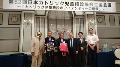 佐山聡名誉顧問らは2018年6月28日、神奈川・ホテルモントレ横浜で行われた日本カトリック児童施設協会全国会議に出席。児童施設の子どもたちのためのランドセル8個を寄贈しました。