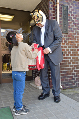 ピカピカのランドセルを背負った子どもたちは、「本当に小学生になったみたい!」と大喜びで園庭を駆け回り、最初は虎のマスクを見て「怖い!」となかなかタイガーマスクに近づけなかった子どもも最後はタイガーと笑顔でタッチを交わしていた。