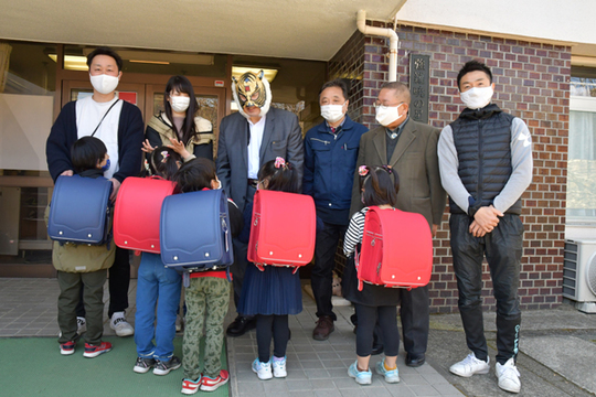 この日は、一般社団法人初代タイガーマスク後援会より、箱根恵明学園、社会福祉法人エリザベス・サンダース・ホーム、社会福祉法人ゆりかご園、強羅暁の星園で暮らす今年4月に小学校に進学が決まっている児童5名へランドセルを贈呈。初代タイガーマスクの手から直接子どもたちにランドセルが手渡された。