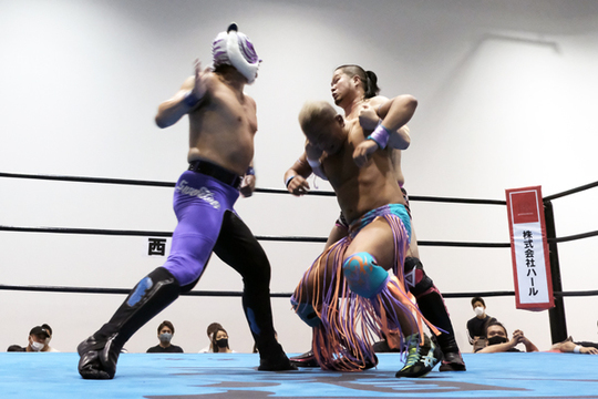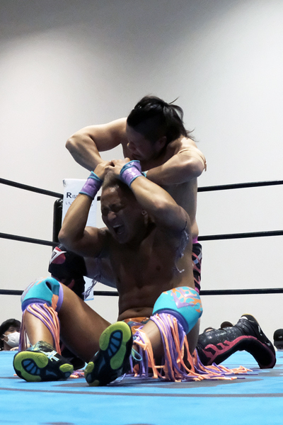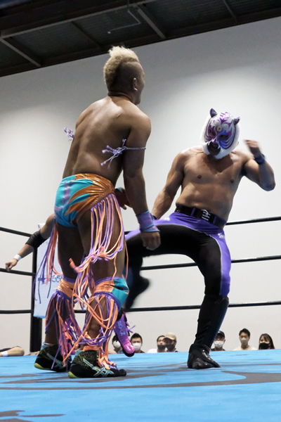 飛び膝をお見舞いすると、コーナーに振った櫻井に、間下と飛び膝蹴りの波状攻撃で追い込む。さらに間下が櫻井を羽交い締めにしてS・タイガーの掌打を誘うが、今度は寸前で身を交わして痛恨の同士討ちに。