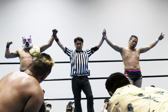 タッグマッチのスピードとコンビネーションで攪乱を狙ってきた常夏サンシャインに対し、落ち着いて対応し、勝るとも劣らぬ15年の絆を見せつけたストロングスタイルプロレスコンビ。