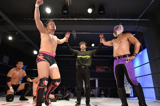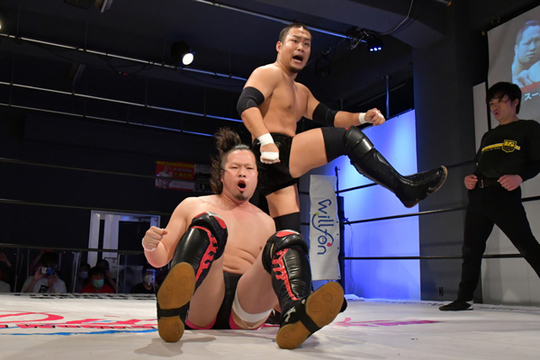 倉垣がジャガーにトラースキックを放ってアシストすると、薮下が永島を振り切り、飛びつき式腕十字のフェイントから入る回転エビ固めも、キックアウトしたジャガーが素早くバックを取ってジャーマン・スープレックス。バックを取り返して粘る薮下をサムソンクラッチで丸め込んで3カウント。