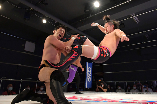 佐藤がロープに飛ぶと青木も追走ラリアットで意地を見せるが、もう一発を狙ったところで佐藤がバックを取ってジャーマン・スープレックス。青木は即座に起き上がって渾身のラリアットからコーナーに上ってフロッグスプラッシュ。青木がラリアットを狙うと佐藤はかわしてロープに走り、飛びついて背後を取りながらのレッグロールクラッチで3カウントを奪った。