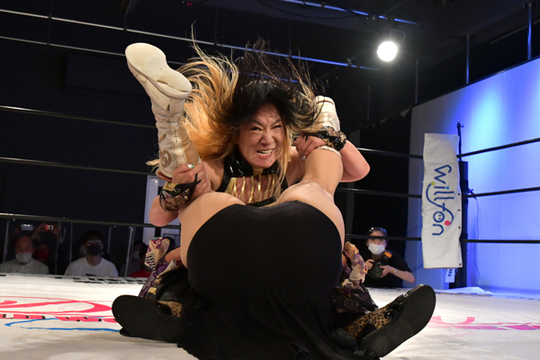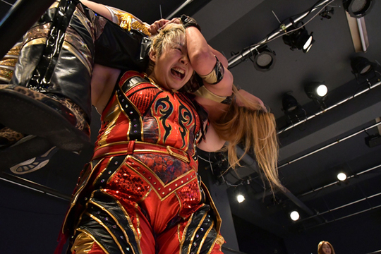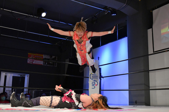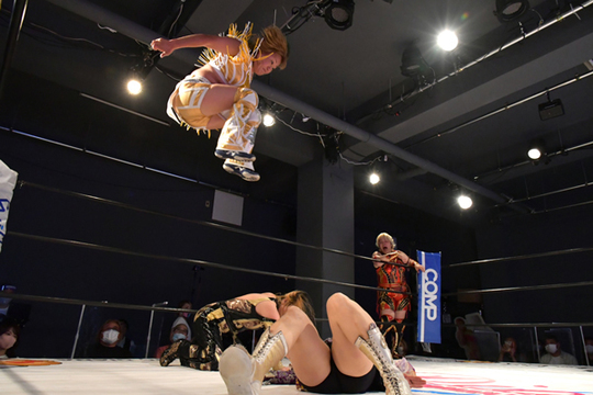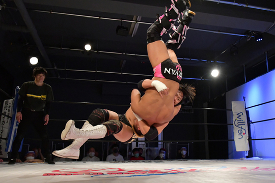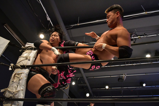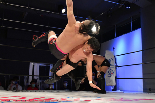 伊藤は阿部とともにスーパーへダブルレッグスプレッドを見舞ってからフェイスロックで絞り上げていくが、スーパーが立ち上がって首投げで切り返しサッカーボールキック。間下にタッチ。