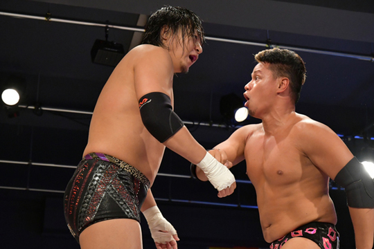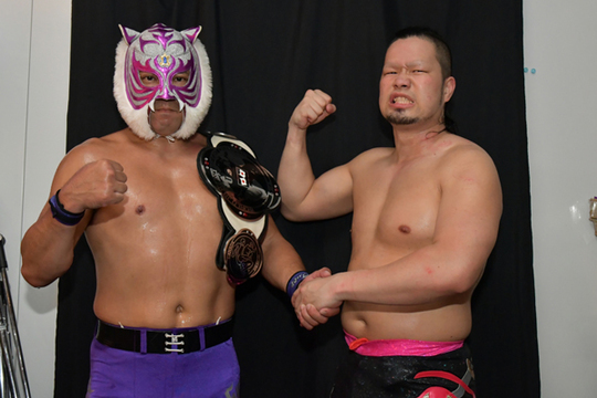 間下「ようやくスーパー・タイガーの横に並べるようになってきている自分自身、強くなってきているしスキルも上がっているのかなと思います。僕はベルトを落としましたけど、ベルトは1個だけじゃないので。こっから自分らしく、もうちょっと毒があっても、狂気があってもいいんじゃないかなという欲が出てきたので。目標はここ(※スーパー・タイガーの持つレジェンド王座のベルトを指して)ですから。チームはチームですけど」