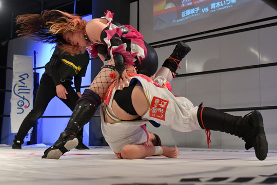 青木がブレイクするとコーナーに振って串刺しジャンピングニー。もう一発を狙ったところで青木がカウンターのショルダータックルで反撃するも、佐藤は顔面ひっかきで怯ませジャンピングニーからレッグロック・スープレックス。さらにダブルアームの体勢に捕らえていくが、青木はショルダースルーで切り返し、ショルダータックルでコーナーに吹き飛ばしてからフェイスクラッシャー、ランニングボディプレス、バックフリップと猛攻。さらにコーナーに上ってダイビングボディプレスを発射するも、佐藤が回避して自爆させ、青木の顔面にランニング・ビッグブートを4連打。