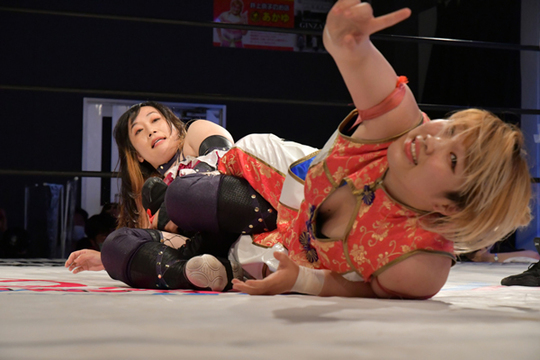 間下はショルダータックル、ボディスラムからロープに飛んでフロントハイキックを発射も、伊藤がキャッチしてアンクルロック。間下が暴れると逆片エビ固めに切り替えていき、間下がロープブレイクするや否やリング中央に引き戻してアキレス腱固めも、スーパーがカット。伊藤は間下のヒザへのニードロップからヒザ裏へのローキックを見舞い、阿部にタッチ。