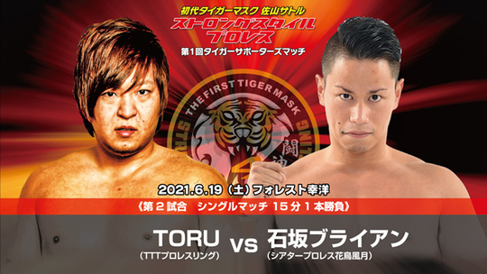 ブライアンはTORUにエルボーを連打していくが、TORUは一発受けるたびに一歩前に出ていってブライアンをロープ際まで追い詰め、お返しのエルボー連打でコーナーに押し込んで串刺しドロップキック、腹部へのダイビングダブルフットスタンプから変形クロスフェイス。続けてDガイストの体勢に入るも、ブライアンが着地してエルボー連打からのジャーマン・スープレックス。さらにコーナー上から身体をまっすぐにして飛ぶダイビングボディプレス。これを返されるとトラースキックからロープに飛ぶが、TORUがカウンターのドロップキックを顔面にクリーンヒット。