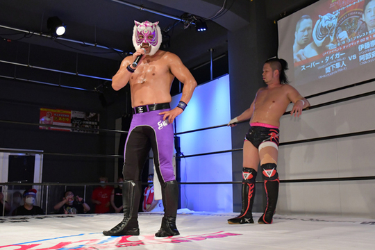 スーパー「皆さん、本日はお足元の悪い中こちらまでご来場いただきまして誠にありがとうございます!我々はタイガーマスク40周年、それをまた1つの区切りに、我々はまた新たな段階、ここディアナ道場から月1で我々の闘いをまた積み重ねていきます。その中でも、女子プロレス団体・ディアナさんとしっかり協力してタッグを組んで、プロレス界をまだまだ!まだまだ盛り上げていきますので、これからも応援よろしくお願いします!そして次は、本戦!7月29日、後楽園ホール!しっかりと、しっかりと!闘いますので、また熱い声援よろしくお願いします!今日はありがとうございました!」