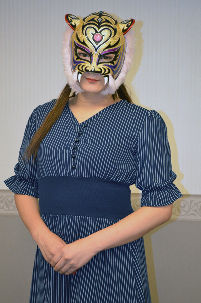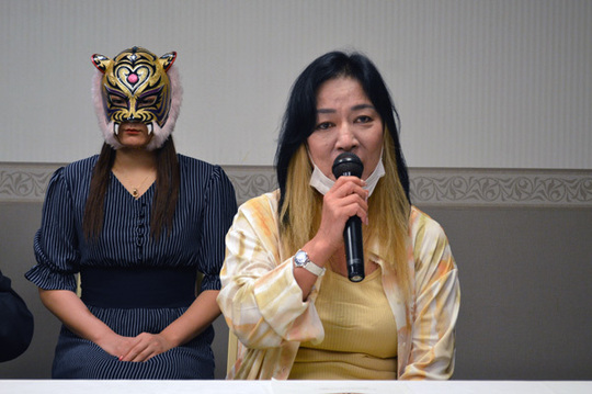 「本日はお忙しい中ありがとうございます。初代タイガーマスク、ストロングスタイルプロレス。この団体は本当に敷居が高くてですね、女子のカードを組むのも毎回頭を悩ませております。今回は、1試合目にLeon対ワールド女子プロレスディアナのななみというカードを組みました。ななみはまだ高校1年生ですが、身体が大きくなり、力もついてきたということで、ストロングスタイルプロレスで試したいという気持ちから、その相手に胸を借りるという意味でLeon選手にさせていただいたカードになります。これもお楽しみいただければと思います。そして私の試合は、久しぶりにの参戦となります青木いつ希選手。ショーンキャプチャーで頑張っておられて。そうですね、2年くらい前に会った頃は新人にちょっと毛が生えたくらいの勢いがある選手だなとは思っていましたが、その後、他団体いろんな試合でカをつけ、久しぶりにぜひ、ストロングスタイルプロレスのリングで暴れていただきたいなと思って、今回はカードを組ませていただきました。そして相手になるSAKI選手、沙恵選手、偶然にも名前が紗恵、SAKIと、名前が似てるなと。ここ1ヶ月でこの2人と別々にあたっているんですが、これまで存じ上げてない選手でしたが、闘ってみてとても骨のある選手であります。今まで基本、私の近くにいた人間しか見ていなかったので、ここにこういういい選手がいるんだ、ここにもこういう良い選手がいるんだということを改めて感じた2人ではあったので、ストロングスタイルプロレスの方でチャレンジしてもらいたいなと思って、カードを組みました。そして、女子のメインでありますタイガー・クイーンなんですが、タイガー・クイーンの相手がDarkerZの2人ですね。ダーク・タイガーとダーク・チーター。チーターの方は、セコンドで暴れてはいましたけど、参戦、対戦するのは初めてになります。新間会長が送った刺客(?)ということで注目はしていたのですが、なかなかできる選手たちで面白いなあと思って、あたっていないダーク・チー夕ーを抜擢しました。ただ言えることはですね、タイガー・クイーンを潰すという形で出てきた3人ではありますが、タイガー・クイーンを潰したいヤツはいっぱいいると思うんですね。皆さんに考え、思い出していただきたいのは、私もこういう立場ではありますが、まだ現役のレスラーです。私もタイガー・クイーンを潰さなければいけないという気持ちになっているのはあるので、その中でタイガー・クイーンを素晴らしい選手と思うからこそ、強い刺客を送っていかなければいけないという新間会長の気持ちも分かりますし、私自身も潰す相手になっていかなければならない。それがやっぱり向上だと思います。私自身のキャリアと年齢を考えると『はあ?』と思われる方もいらっしゃるかと思いますが、やっぱりプロレスは見せるものではありますが、勝負のものでもあると思います。ですので、勝っていかなければ意味はないと私は思っておりますので、今後タイガー・クイーンを潰すために私はなにかを考えていきたいと思っています。それを皆様に再確認していただければと思います。後楽園ホール大会、女子も男子も、前回は最高の試合をしてくれました。本当にどの試合もいい試合だった、前回の後楽園ホール。皆さんも御存知だと思いますが、たぶんその試合に負けない闘いを全選手やってくれると思います。ぜひご期待いただいて、よろしくお願いします」