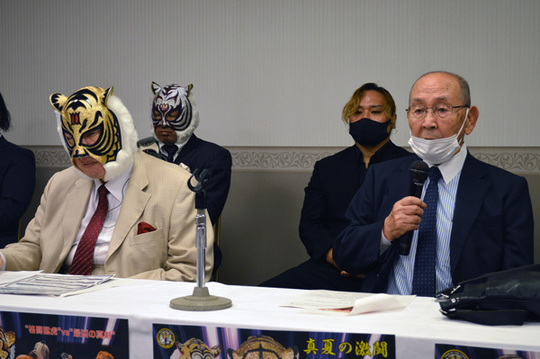 そして昨日の産経新聞における、『もし日本が戦争になったらあなたは国のために闘いますか』というアンケートで、闘いますと言われた国民が13%。タイガーとともに言いました。『佐山ちゃん、オレは87歳だけれども日本の国を守り、家族を守るために俺は闘いに行くぞ』と。『新間さん、私も行きますよ』と。これが本当に国を守り、そして自分たちの子孫のために、国を残すために、その国のために闘うという日本人が13%しかいない。この6メートル40のリングの中で、私はいままでなにをやってきたんだろうかと。ジャガー横田、アントニオ猪木、そしてジャイアン卜馬場、ジャンボ鶴田、(初代)タイガーマスク、いろんな人が脳裏によぎります。この後楽園におけるコロナの中の闘いで、観客は望めるべくもありません。しかし、アントニオ猪木とタイガー・ジェット・シンが私に言ったことがありました。『どんな地方でどんな少ない人たちであろうと、我々は6メートル40の中で死力を尽くして闘う。こういう姿勢が新間、客を呼ぶんだ』と。これがアントニオ猪木の持論でありました。それを引き継いだのがタイガーマスクであります。そして、それを共鳴して参加してくれたのがジャガー横田さんであります。そしていま、新たにタイガー・クイーンが生まれました。タイガー・クイーンは言葉では語らず、口では語らず、そして文字でもって皆さんに自分の考え。私は携帯はガラケーしか使えません。しかしウチの孫は小学校4年ですけど一生懸命発信しております。そういった形でもって彼女はいろんな形で持って世のため人のため、またプロレスのためにそういう市場で自分の心を打ち明ける。そういう気持ちになってもらうということを私は望んでやみません。この25日の日は、私にとってはコ口ナの中で本当に景気もなにも、国民の心も、そして日本の国を守るというそういう気持ちを持った人たちが13%しかいないというこの国を、私たちは元気づけるために、プ口レスというのはそういう精神的なもの、肉体的なものを6メートル40の中から発信するんだという、そういう気持ちは猪木さん、馬場さん、ジャンボ鶴田、坂口さんでありタイガーマスクは持っておりました。これから我々がやる初代タイガーマスクの、あのリングの中の動きを見るたびに、そして1人、また1人とあの世に去っていく人たちがおります。25日には、ジーン・ラベールというモハメド・アリとアントニオ猪木の闘いのレフェリーをやってくれた方の追悼ゴングをリング上で、これはターザン山本さんの方から知らせがあって、『新間さん、アリ猪木戦を思い出してくれ』と。ああいうイベントをやったということは、たった1団体でヘビー級というのは世界でたった1人だったと。いまは3団体、4団体があって世界チャンピオンは80人90人いる。あのときはたった1人だった。そのモハメド・アリとアントニオ猪木が闘った。それを裁いたのがジーン・ラベールという全米の柔道のチャンピオンでありました。8月25日には、そのジーン・ラベールを追悼するターザン山本の思いを私もリング上で受け止めて、そういう人たちの追善、そして10カウントのゴングを打ち鳴らしたいと思っております。ジャガー横田が、私どもの初代タイガーマスクのリングに上がり、そして女子プロが上がってくれている。そして、タイガー・クイーンができた。新しい者が次から次へと出てきて、そして古き者はどんどんこの世から去っていく。その思い出というものを6メートル40のリングの中に残していきたいというのが、私の気持ちであります。長々としゃべりましたが、皆さん、いまの日本というのは、本当に自分たちが気持ちをひとつにして、この本当にいま周囲がどういう状況かということを考えて、日本の国のために、安倍先生が思い描いた日本というこの美しい国、万世一系の2600年続いたこの日本というものを私たちは守り抜いて、そして子孫のために残していかなくてはならない。それを少ないですけども6メートル40の中の、プロレスというそのリングの中から発信していけるような形になれば、私はいかがなものかということを皆様にお伝えして挨拶に代えさせていただきたいと思います」