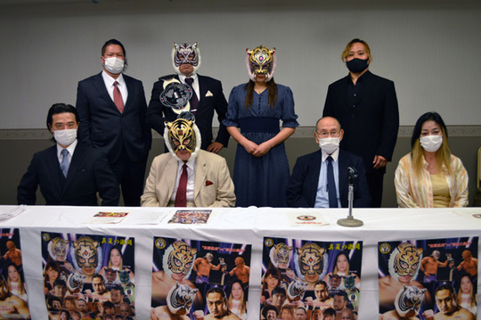 平井丈雅代表「初代タイガーマスク佐山サトル総監率いるストロングスタイルプロレスは、一般社団法人初代タイガー後援会代表理事新間寿会長、そして、女子部門を統括されるジャガー横田様、選手の皆様とともに、6月9日に続いて8月25日後楽園で大会をさせていただきたいと思います。今回はメインイベントで、前回はタッグで激突しました2AWの真霜拳號選手がスーパー・タイガーの王座に挑戦いたします。そしてタイガー・クイーンは前回DarkerZ(ダーカーズ)乱入を受けまして、決着戦とも言うべきタッグマッチに臨みます。船木誠勝選手は前回一騎打ちの大激闘を繰り広げた関根“シュレック”秀樹選手とタッグを組まれます。そして間下隼人は日高郁人選手とタッグを組んで関本大介、初参戦の入江選手と激突いたします。今回もフレッシュな顔ぶれが初参戦が決定しております。、入江選手、SAKI選手、紗恵選手、Leon選手、新たなストロングスタイルにふさわしい選手の闘いを、みなさまにお披露目させていただきます。また、本年7月29日にデビュー1周年を迎えましたタイガー・クイーンが本日よりTwitterを開始することになりました。皆様ぜひご注目、拡散をよろしくお願いいたします」