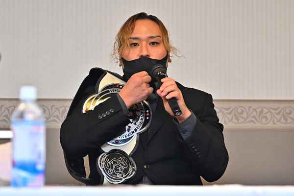 「今回、防衛戦の相手としてシュレック選手が正式に決定したということで。ここまでスーパー・タイガーから獲り、間下隼人から防衛し、『次誰がいるんだろうな』と思っていたところへ、本当に意外な相手が手を挙げてきたなと思ってます。ちょっと、いっときすごく熱くなってたシュレック選手が今この場に来ていないのはちょっと拍子抜けなんですけど、ただシュレック選手の強さっていうのは本当に皆さんもわかっていると思いますし、僕もよくわかっているつもりなので、相手として全く不足はなくて。なんだったら、自分としてはいちばん苦手なタイプになるのかなというところもあるんですけど。ただ、このベルトを持っている以上、『真霜拳號こそがストロングスタイルだ』という自負がありますので、今回もなんとしても防衛したいと思います」
