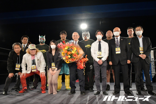ここで本日6月26日世界格闘技の日を記念して、アントニオ猪木とモハメド・アリの世紀の一戦を実現した新間寿会長へ、世界の子供たちへのボランティアをご一緒している小園なつきさんと、初代タイガーマスク勝守などでご一緒している神田明神の岸川禰宜さんから花束が渡された。