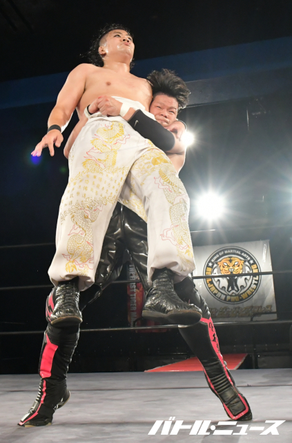 ここで日高は鈴木の足を取ってエプロンに出るとロープ越しでのドラゴンスクリュー、リングに戻って足4の字固めで痛めつけてからショーンキャプチャーを狙うが、鈴木はこれを耐えて前にホイップ。着地した日高の後頭部にヨーロピアンエルボーからワンハンドバックブリーカー、さらにダブルアームスープレックス固めで絞り上げると日高はたまらずギブアップ。
