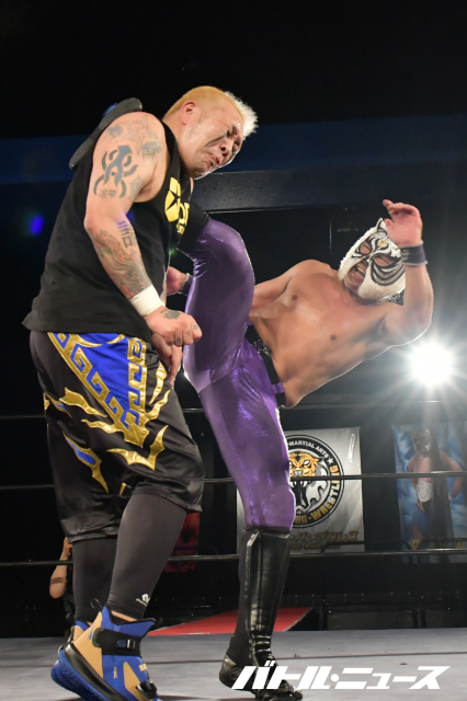 スーパーはタイガースープレックスを狙うが、論外がバックキックの金的で逃れてロープに飛んで走り込む。だがスーパーはハイキックで迎撃し、胴絞めスリーパーでギブアップを奪った。