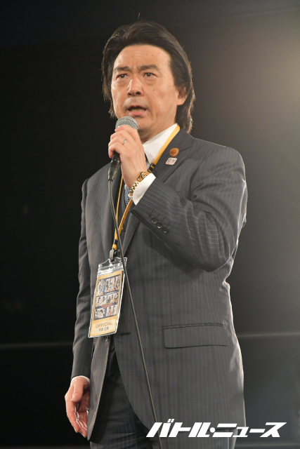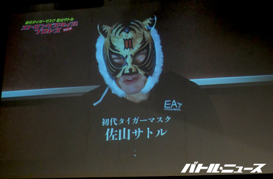 その佐山サトルは今日この場にはいません!5年前の戦い、長年の戦いと、色んな戦いにおいて、体を壊し、狭心症で手術をし、この5年間皆さんの前にはなかなか立つことができない、4月、6月、この大会にも出ることはできない。佐山サトル総監は言いました。この6月26日という新間会長にとっても日本プロレス界、世界格闘技界にとってもいちばん大事な人、新間会長とともに、テレビを見ているご覧の皆様とともに、関係者マスコミさんとともにこの日を盛り上げてほしい。この盛り上げの一番となるのは今日出る20人の選手の皆様でございます。20人の選手の皆様、佐山サトルの思いを込めた20人の方たちが、今日画面を通して皆様に戦いをお見せいたします。佐山サトルは、最強の肉体、最強の精神、そして新間会長が名付けた闘う神、闘神、闘神初代タイガーマスクは最強だと思っております!佐山サトルが戻ってくるまであと僅かのお時間をいただきたいと思います!その皆様の思いと、佐山サトルの思いと新間会長とレスラーたちの思い。今日この時間私達が皆様のお時間を頂戴し、画面を通して、見ていただきたいと思います!よろしくお願いします!ありがとうございました」