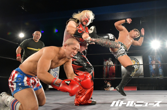 岡本が羽交い締めにしたロッキーへ矢口が有刺鉄線バットをボディにフルスイング。さらに岡本が有刺鉄線バットで殴ろうとするが、ロッキーが逃れるも岡本はとまる。再度矢口が羽交い締めにして岡本が走り込むが、ロッキーが避けてショルダータックルが誤爆すると、岩崎が岡本にバックドロップからロッキーが矢口の有刺鉄線バットに右ストレート。だが耐えた矢口に岩崎が背後からビッグブーツを叩き込み、よろけた矢口が四つん這いのロッキーにコケたところをロッキーが丸め込み3カウント。