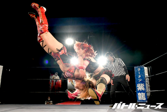 朱里はサッカーボールキックも避けた都がスクールボーイも2。都はみやここクラッチも2。都はリバースタイガードライバーからフォールも2。