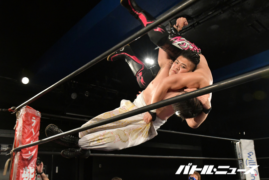 立ち上がった間下がコンビネーションの掌底からロープに飛ぶが、横山はカウンターのマンハッタンドロップから場外に投げ捨て乱闘。