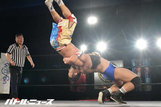 鈴木が足をとっていくが、日高は腕をとり極めようとする。だが鈴木がハンマースルーを堪えていくが、日高が腕を極めたままアームホイップ。自らも前転して腕を離さず絞め上げていく。ヘッドロックに移行するが、鈴木が前転してフォールも日高はヘッドロックを離さずに1で返し絞り上げる。