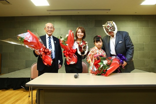 「ありがとうございます。本当にこのような機会を開いていただいて、新間会長、そして佐山先生、本当にありがとうございます。私はアメリカにいくんですけども、WWEでもしっかりと佐山さんのストロングスタイル、そしてチャリティーの精神を受け継いで、WWEにいったら世界中でチャリティー活動をおこなっていきたいと思っています。しっかりと私が受け継いで世界に広めていきますので、みなさんよろしくお願いします。今日は本当にありがとうございます」