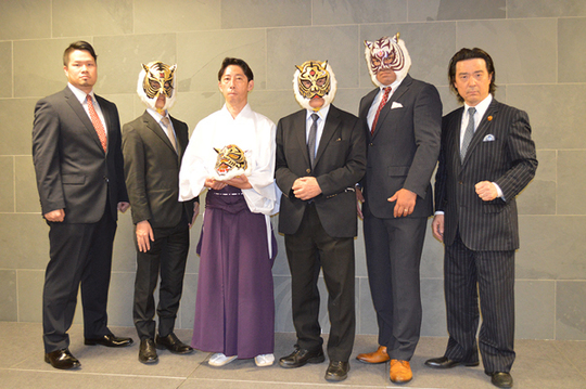 平井「神田明神さまと初代タイガーマスク、新間寿とのコラボレーションの勝守。この勝守、もちろん一番弟子のスーパー・タイガー、そして間下隼人含めて、私たちも常に持ちます。このお守りとともに、タイガーマスクとともに、神田明神さまとともに、新間寿とともに歩んでいただきたいと思います」