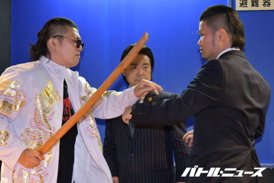 間下「RJPWに長くいて、“行儀よく”みたいな部分があったんですけど、こういう相手はどうせ場外とか木刀とかガチャガチャするんでしょう。そういう方が本来は得意ですから。RJPWというのは、掣圏道、掣圏真陰流という市街地実戦型ですから。“目には目を”じゃないですけど、平井代表が納得できるような終わり方にしてやりますよ」