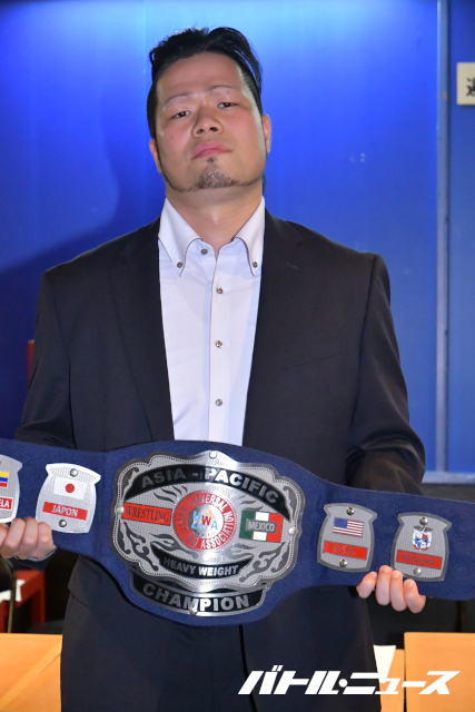 平井代表「本日は追加対戦カードといたしまして、UWAアジアパシフィックヘビー級選手権試合を発表させていただきます。前回の3月大会で将軍岡本選手が保持していました王座をRJPW間下隼人が奪取し、新チャンピオンとなりました。第4代王者の間下隼人に今回、挑戦いただくのは、ブードゥー・マーダーズに所属しております横山佳和選手です。それでは、おふたりを呼びたいと思います」