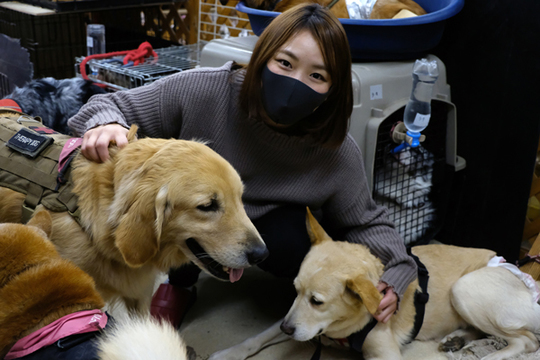 Sareee選手はペットシーツやフードなどの支援物資を贈呈させていただいた後、「レスキュードアニマルネットワーク」スタッフの皆様より施設内での訓練、治療状況等のご説明を受け、仔達と触れ合い、