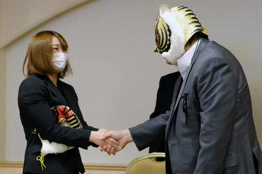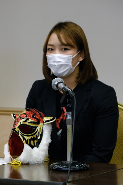 最後に、11月9日に神田明神におきまして新間寿会長、初代タイガーマスク/佐山サトル総監からストロングスタイルと社会福祉活動(チャリティスピリット)を受け継ぎ、伝承特別マスクを授与されましたSareee選手から、渡米へ向けてのご報告を賜りました。