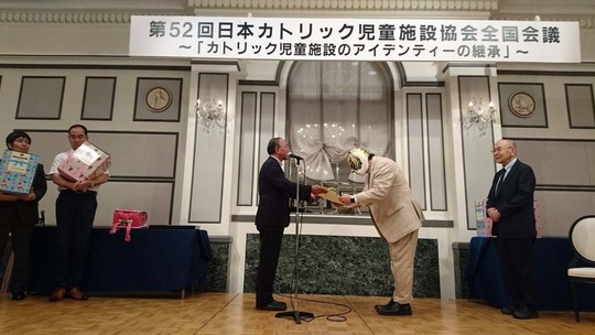 佐山聡名誉顧問らは2018年6月28日、神奈川・ホテルモントレ横浜で行われた日本カトリック児童施設協会全国会議に出席。児童施設の子どもたちのためのランドセル8個を寄贈しました。